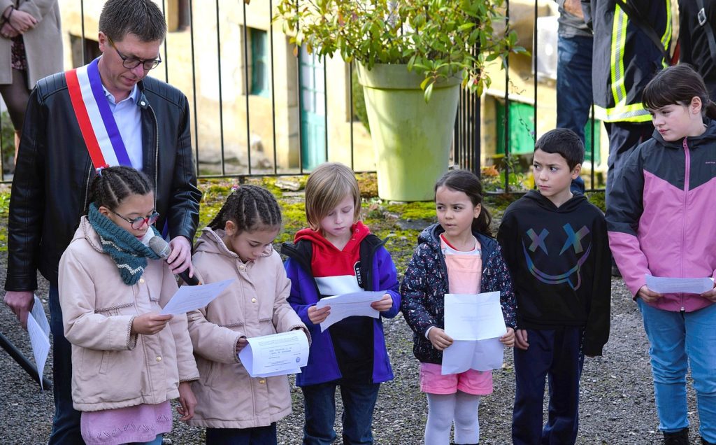 Cyrille FAUCONET, maire de Trouhaut, tend le micro aux enfants de sa commune pour la lecture de la lettre de l’UFAC. Devant cinquante-cinq de ses administrés, il a reçu à l’occasion de sa dernière cérémonie en qualité de maire, le témoignage de la gratitude de la section pour son engagement constant en faveur du devoir de mémoire.